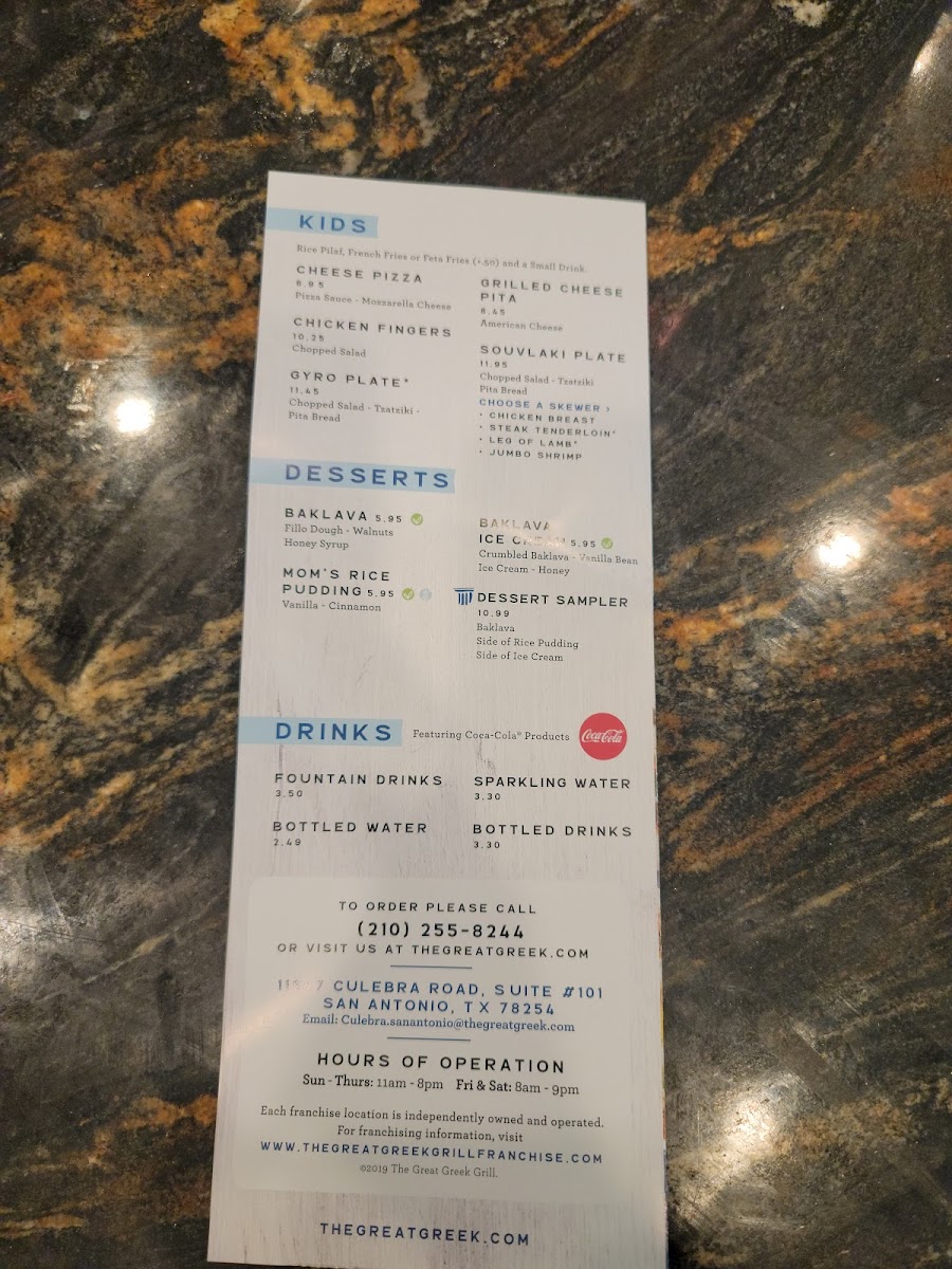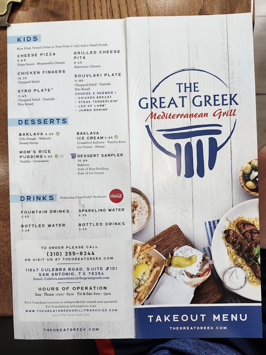 Welcome to The Great Greek Mediterranean Grill in San Antonio, TX, where every dish is a celebration of authentic Greek flavors. Located at 11647 Culebra Rd, this charming grill offers a menu that boasts a delightful array of appetizers, salads, gyros, and more.